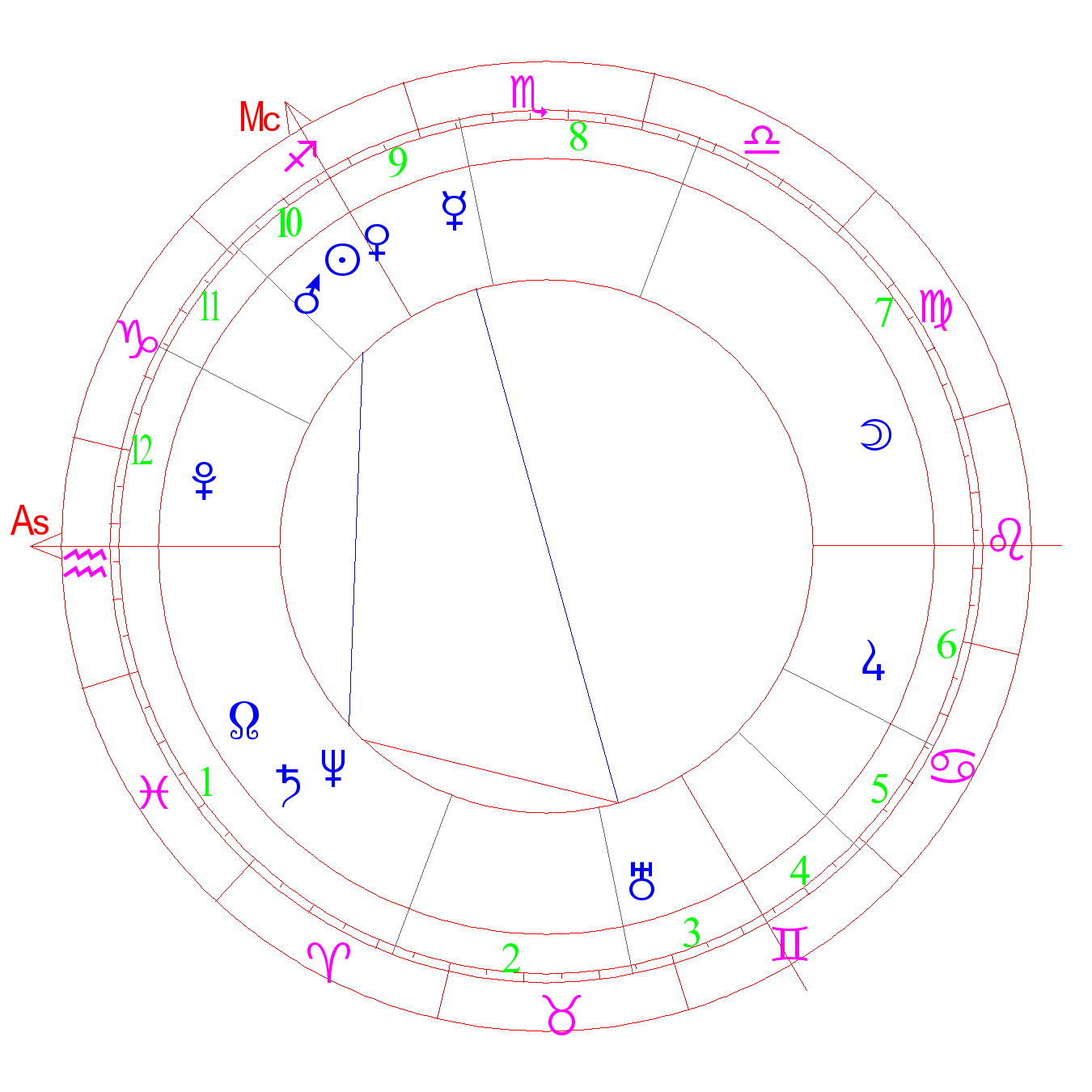 Изобретательный ум. Способности к наукам. При сильной заполненности знаков Тельца, Рака, Рыб - многодетность. [-] беспокойная, агрессивная натура. Жизнь в борьбе, человека предают, ему мстят (АША). Острый ум, боевое поведение, победа. Живописные способности. При повреждении - опасность самоубийства. Градус Меркурия (Кефер)